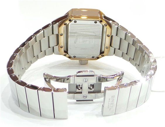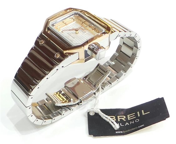 Orologio Breil Milano al quarzo donna. Cassa in acciaio lucido con inserti colore ramato mm 32. Corona a vite e fondo WR 10 atm chiuso con 4 viti. Cinturino in acciaio con chiusura deploiante a scomparsa. Quadrante a righe oro rosa e argentato centrale con 4 brillantini totali a ore 12 e 6.