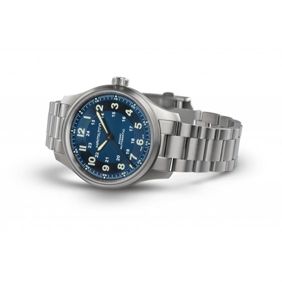 Hamilton Khaki Field Titanium H70545540 L'Hamilton Khaki Field H70545540 è alloggiato in una cassa in titanio da 42 mm leggera, altamente funzionale e di autentica ispirazione militare. È stato trattato con una finitura spazzolata, che completa la natura utilitaristica dell'orologio. È composto da una lunetta fissa e una corona push-pull situata a ore 3, su cui è impresso il logo Hamilton "H". L'orologio è completato da un vetro in cristallo zaffiro che gli fornisce una protezione superlativa contro graffi e rotture. Il quadrante dell'Hamilton Khaki Field H70545540 è presentato in un'elegante tonalità blu. Presenta un design a due fasi e un formato 12/24 ore che rafforza l'autentica atmosfera militaristica dell'orologio. Un microtelefono a siringa si estende dal centro del quadrante, è stato generosamente rivestito con un materiale luminescente che consente di leggere il quadrante al buio. La lancetta dei secondi allungata è dotata di una freccia che percorre senza sforzo il percorso dei 60 secondi che circonda il bordo del quadrante. Il logo Hamilton è presentato in bianco sotto l'indicatore delle 12. Il Khaki Field è presentato con un cinturino in pelle nabuk beige, che si chiude tramite una fibbia ad H in acciaio inossidabile. Il movimento automatico calibro H-10 di Hamilton alimenta questo segnatempo e offre un'incredibile riserva di carica di 80 ore. Ha una precisione di +/- 15 secondi al giorno. È dotato di una lega antimagnetica chiamata Nivachron ed è resistente all'acqua fino a 100 metri, il che significa che può essere indossato durante lo snorkeling.
