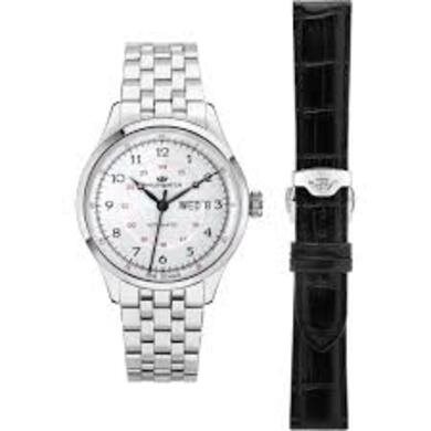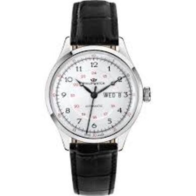 Special Pack Philip Watch Museum. Orologio in acciaio, cassa mm 40 spessore mm 12. Secondo cinturino in pelle nero stampato. Quadrante bianco con dettagli neri e rossi, lancette nere, datario (day date) al 3. Vetro zaffiro a doppia curvatura. Fondello a vite con movimento a vista, corona a vite. Movimento (Sellita SW220) automatico Day date. Impermeabilità 3 atmosfere. Il pack contiene cacciavite professionale per la sostituzione del cinturino.